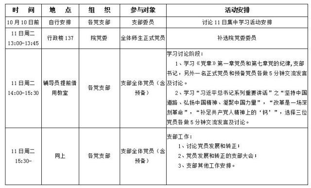 按照校党委组织部关于组织开展“两学一做”通知的要求,院党委决定10月11日下午组织全院党员进行集中学习和相关组织活动,具体安排如下: