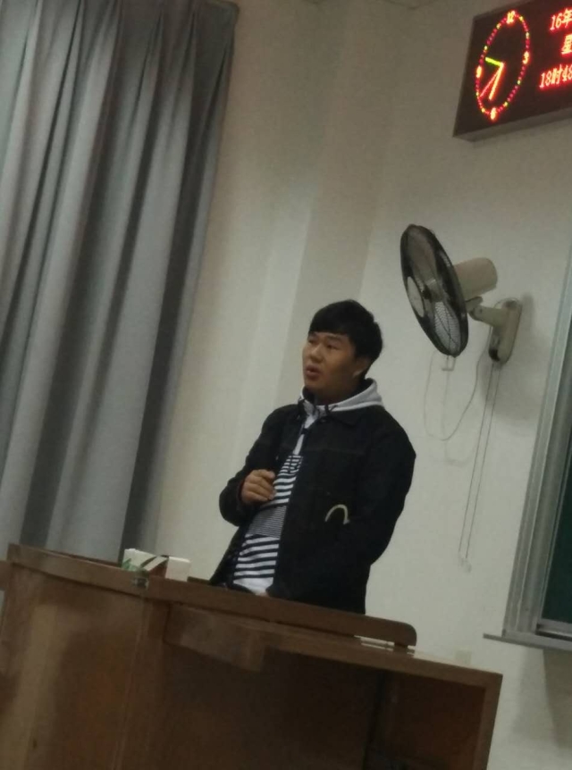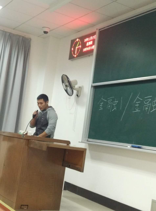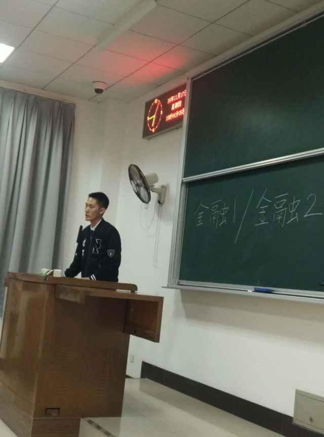 最后,金融学发主席王毅以幽默的语气,分享了他的学习生活,王毅同时还担任院学生会主席,他告诉我们要处理好学习和学生组织活动的关系,明确我们的主要身份是一名学生,学习是学生的本职工作,不能因为社团活动而耽误了学习,否则便本末倒置了。