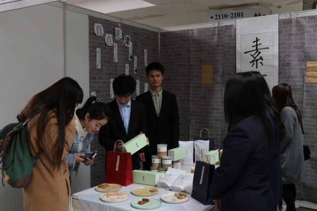 活动伊始,各小组凭借精美的产品,专业的讲解,吸引了诸多同学,参观同学络绎不绝。本次比赛成绩由大众评委分数和专业老师打分组成。因此为了争取到学生的投票,参赛选手们使尽浑身解数向参观同学介绍各自产品,有小组成员穿着家乡民族服饰宣传介绍家乡特产,给大家了留下了深刻印象。