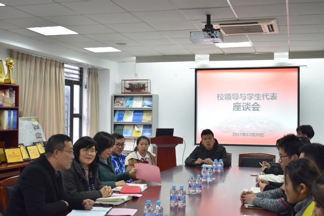 12月20日,bat365中文官方网站在学院202会议室召开校领导与学生代表座谈会。联系我院的校领导、总会计师徐瑶玲出席座谈会,bat365中文官方网站党委书记岑伟平、bat365中文官方网站党委副书记商利新、bat365中文官方网站团委书记王方方以及新生辅导员参加,与研究生、新生和学院社团等25名学生代表进行亲切座谈。会议由bat365中文官方网站党委副书记商利新主持。