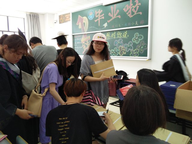 在毕业典礼结束之后,同学们以班级为单位到第四教学楼领取毕业材料。低年级志愿者们在各班级的教室里画上生动活泼的毕业班板报,为学姐学长们留下诚挚的送别祝福:祝愿2018届的学姐学长们勇敢踏上未来的征程,为实现梦想继续砥砺前行。