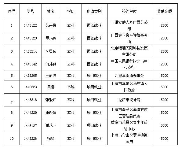 根据《bat365中文官方网站应届毕业生赴西部、艰苦行业就业奖励办法》(沪海洋学〔2017〕39号)文件精神,本着“公平、公正、公开”的原则,经个人申请、学院审核,现拟对我院符合赴西部、艰苦行业就业奖励申请条件的2018届应届毕业生名单公示如下: