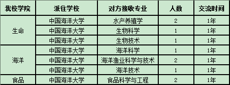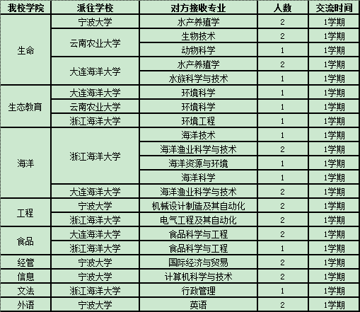 为了加强国内海洋类高校间合作,优势资源互补和共享,促进学生培养和学术交流,使学生拓展视野,感受他校的校园文化与学术氛围,提高综合素质与能力,根据我校与中国海洋大学、宁波大学、浙江海洋大学、云南农业大学、大连海洋大学本科生合作培养的协议,经校间协商,2019-2020学年秋季学期将选派我校若干名本科生到上述学校进行短期学习。现将选拔工作通知如下: