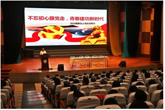 2019年9月1日下午大学生活动中心报告厅座无虚席,学院专职组织员张闻以《不忘初心跟党走,青春建功新时代》为题做了入党启蒙主题讲座,结合学生党员发展的各方面规定,从党的基本知识简介、大学生入党的规定程序及端正入党动机、争取早日入党三个方面进行详细讲解。引导大家树立正确的世界观、人生观和价值观,增进了新生对党的了解与感情。讲座通过回顾党的历史、走进党的建设以及了解党的发展,逐一向全体新生介绍了党的性质宗旨、指导思想、领导地位和新时代党的历史使命。倡议作为新时代的新青年牢记党的使命,不忘初心跟党走,自觉向党组织靠拢,从小事做起,从自身做起,将个人的梦想融入中华民族伟大复兴的中国梦,在实现中国梦的生动实践中放飞青春梦想,在为人民利益不懈奋斗中书写人生华章。