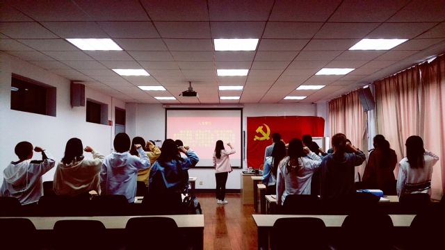 本次主题党日活动从三个方面展开,重温入党誓词、重读入党志愿书、支部党员忆初心检自我。面对党旗,举起右拳,支部组织委员王琳带领支部同志一起重温入党誓词,铿锵有力的宣誓声响彻教室,深深地感染着在场每一个人。