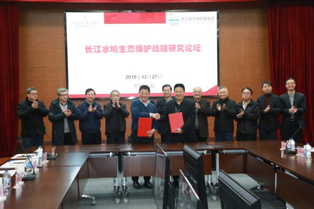 论坛开幕式由长江水域生态保护战略研究中心常务副主任潘迎捷教授主持,bat365中文官方网站书记吴嘉敏、湖北省长江生态保护基金会理事长王利民致辞;长江水域生态保护战略研究中心主任李家乐和湖北省长江生态保护基金会理事长王利民在各位专家见证下举行合作签约仪式。