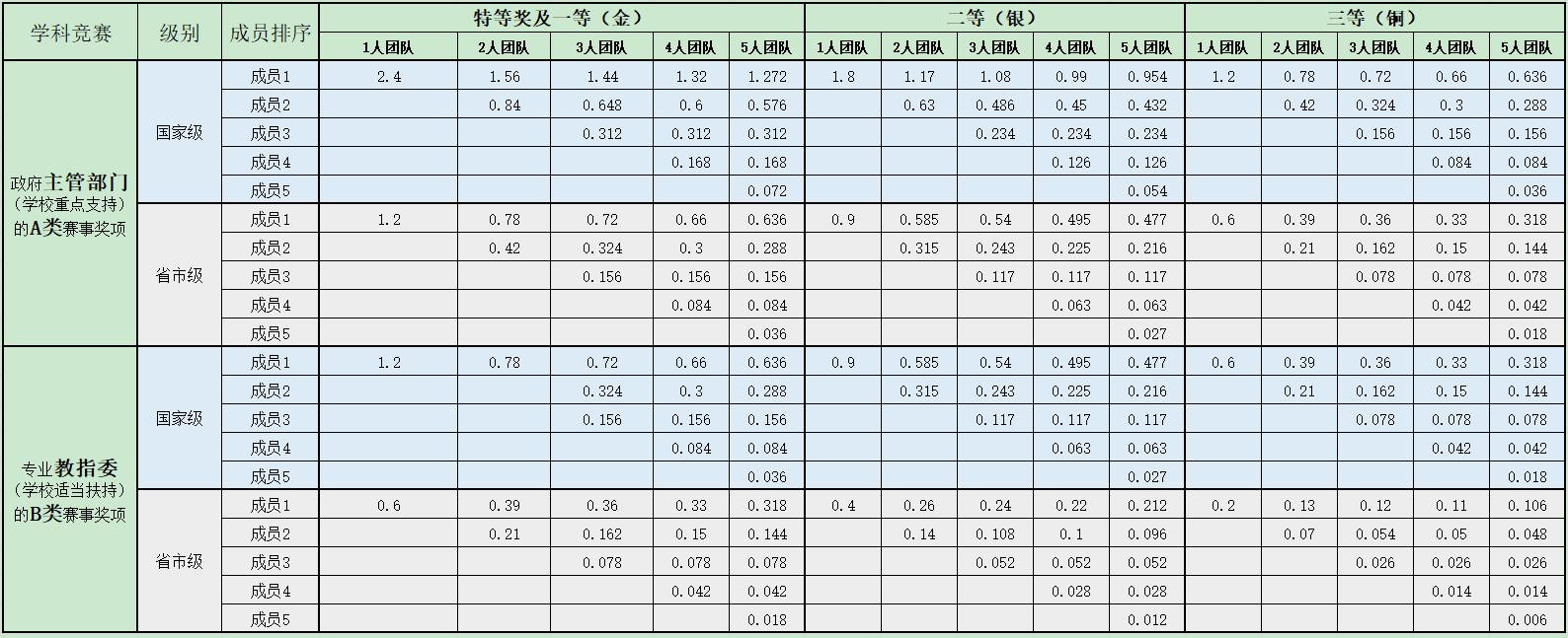 政府主管部门(学校重点支持)的奖项 | 国家级 | 2.4 | 1.8 | 1.2 |