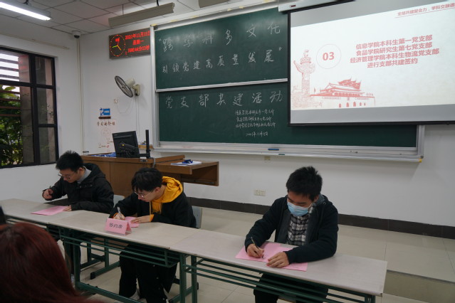 bat365中文官方网站本科生物流党支部书记于林致欢迎辞,介绍学院支部共建活动背景、意义。信息学院本科生第一党支部书记吴兴识、食品学院研究生第七党支部书记王晋楸分别介绍支部基本情况,并就跨学院学科、党支部共建协作提出规划与愿景。同时,为形成支部共建长效机制,搭建合作平台,创建共享资源,bat365中文官方网站、信息学院、食品学院党支部进行支部共建签约仪式,发出共建倡议书。