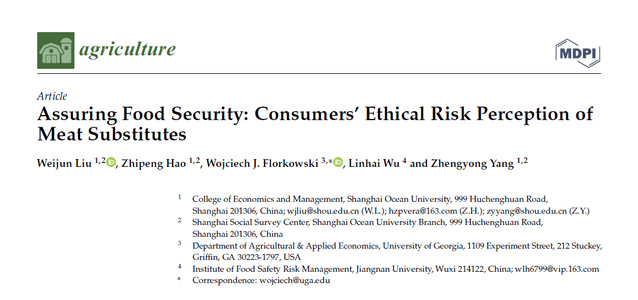 经济管理学院刘为军副教授的研究领域主要为食品经济管理、食品安全管理,正在承担教育部人文社科基金等科研项目。受疫情影响,学校暂停了校内校外人员的流动,课题组的调研和交流等活动都受到较大影响。为应对这一不利情况,课题组将原校内定期组会改为线上进行。每周五下午,刘为军都会与其指导的研究生在腾讯会议室准时见面,针对性地对每位同学的学习、科研问题进行交流指导,并持续加强与国内外同领域专家的深度研究与合作,为项目研究提供了更加有力的支撑。他以第一作者与其指导的研究生郝志蓬、美国佐治亚大学农业与应用经济系Wojciech J. Florkowski教授、江南大学食品安全风险治理研究院吴林海教授、经济管理学院杨正勇教授合作完成的研究论文“Assuring Food Security: Consumers’ Ethical Risk Perception of Meat Substitutes”在学术期刊《Agriculture》发表。