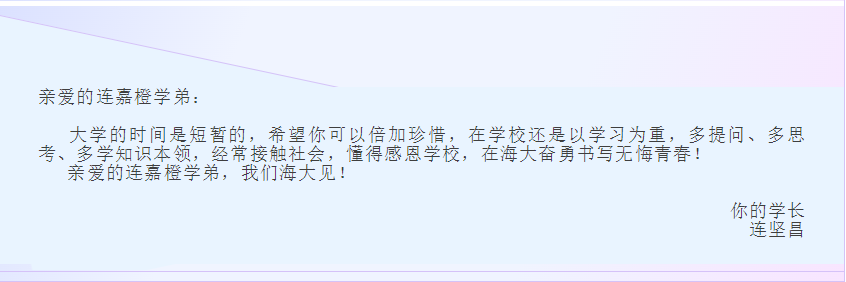 最近几天,连嘉橙正在准备入学所需的各种生活用品。连坚昌也在连嘉橙的行李里放进了一样特殊的礼物:不同时期校名的纪念礼盒。同时,连坚昌还为连嘉橙写下寄语。