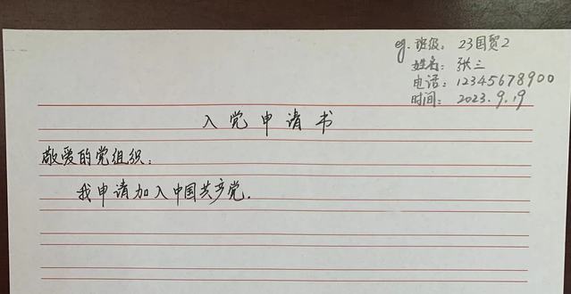 (6)为便于党支部顺利开展谈话,请在撰写好的入党申请书第一页右上角,用铅笔备注好班级、姓名、联系方式、落款时间等信息。(详见下图首页样张)