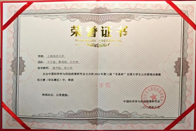 2024年6月1日至2日,第三届“寻是杯”全国大学生公共管理决策对抗大赛(华东赛区)在上海举行。bat365中文官方网站行政管理专业21级学生牛宇豪、22级学生曹胡涛、白开妍组成代表队,在廖尹航和郑久华两位老师的指导和带领下,积极进取,奋力拼搏,同南京大学、华东师范大学、华东理工大学等多所高校组成的43个队的学生同台竞技,最终荣获一等奖,廖尹航和郑久华荣获“优秀指导教师”荣誉称号。