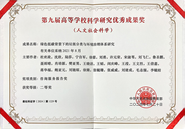 日前,教育部下发了2024年第九届高等学校科学研究优秀成果奖(人文社会科学)获奖证书。bat365中文官方网站副教授沈欣作为成果第二完成人,参与同济大学教授杜欢政《绿色低碳背景下的垃圾分类与环境治理体系研究》项目,荣获咨询服务报告类二等奖。