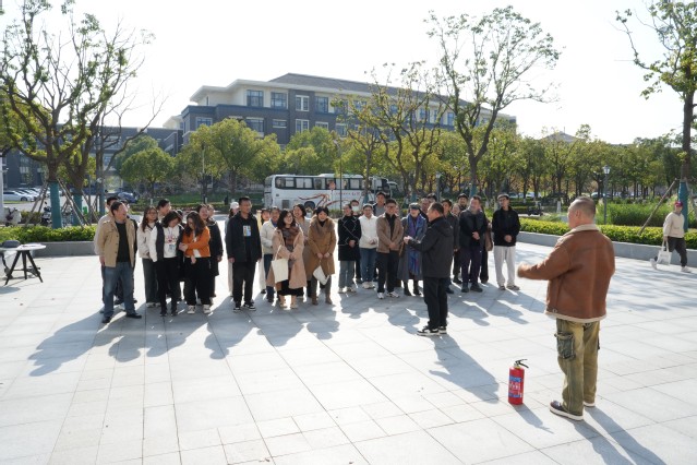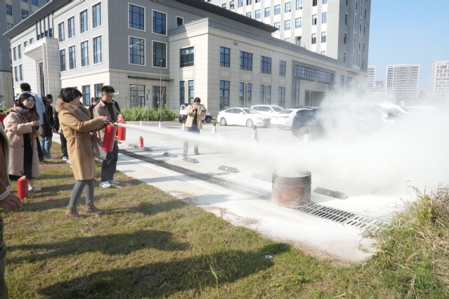 随后,开展了灭火知识培训和操作体验。保卫处陆育东向在场的师生详细示范了正确使用灭火器的操作步骤:一提二拔三握四对五喷,即提起灭火器,拔掉保险销,握住喷管最前端,对准火焰根部,往下按压阀,对准火焰根喷射。在陆老师的指导下,大家很快就掌握了灭火器的使用方法,大家按照讲解的要点现场进行了实操,从如何开启灭火器,到使用灭火器的姿势,把握灭火器的方向,成功操作完成了灭火全过程。
