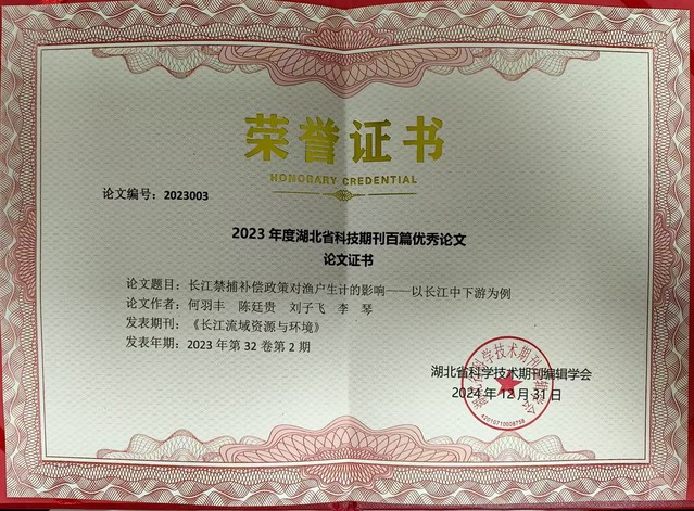 为深入贯彻党的二十届三中全会精神,认真落实习近平总书记关于加强培育世界一流科技期刊和在湖北考察时的重要指示,受湖北省科学技术协会委托,湖北省科学技术期刊编辑学会组织实施了2023年度湖北省科技期刊百篇优秀论文遴选工作。经各期刊社(编辑部)推荐、专家评审组初评、复评和公示,近日评选结果公布,bat365中文官方网站陈廷贵教授指导的2019级渔业经济与管理专业博士研究生何羽丰发表在《长江流域资源与环境》期刊上的《长江禁捕补偿政策对渔户生计的影响——以长江中下游为例》成功入选。这不仅是对bat365中文官方网站研究生学术成果的肯定,也充分体现出学院研究生人才培养高质量和深厚的学科底蕴。