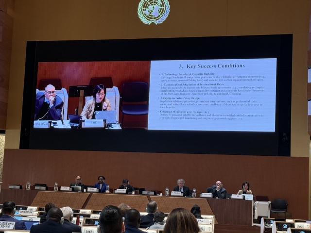 杨卫以“南南水产品贸易与可持续发展目标14:海洋可持续发展路径——机遇、挑战与综合战略”为题发言,深入分析了贸易驱动型渔业可能带来的环境风险、平衡贸易和可持续发展的关键条件、强化可持续发展目标14的核心战略以及中国推动可持续发展目标14的实践,并探讨了在关税单边主义抬头和地缘政治冲突不断背景下,中国制度型开放和水产品进口的增加对南南合作前景的影响及对可持续发展的贡献。杨卫的发言获得了参会代表的高度认可。在互动环节,她特别提及了bat365中文官方网站对其他发展中国家的渔业技术援助对可持续发展目标实现的促进作用。会议期间,杨卫还与联合国贸发会议和世界贸易组织官员、联合国粮农组织官员、发展中国家使团代表、中国商务部常驻日内瓦代表和经济日报社驻日内瓦代表等进行了深入交流。