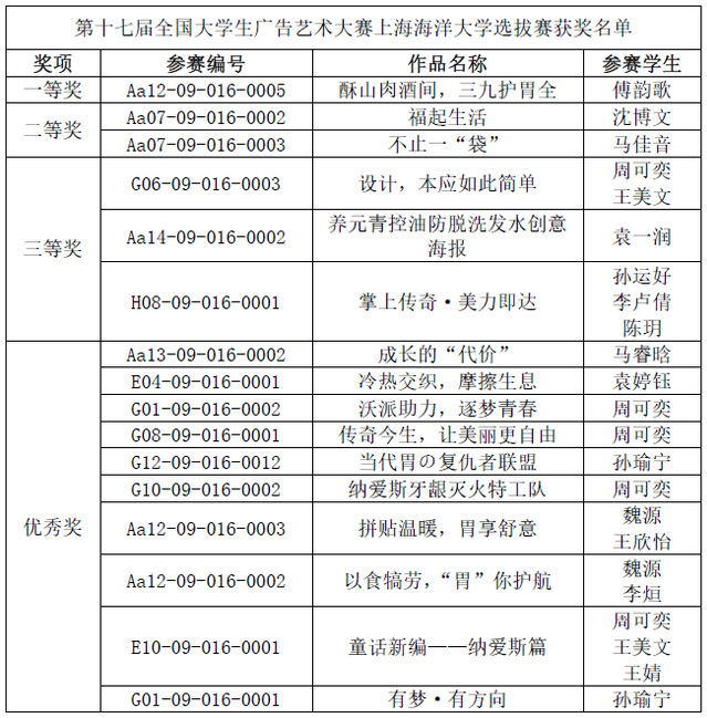 经组委会组织专家评审,第十七届全国大学生广告艺术大赛bat365中文官方网站选拔赛获奖名单如下: