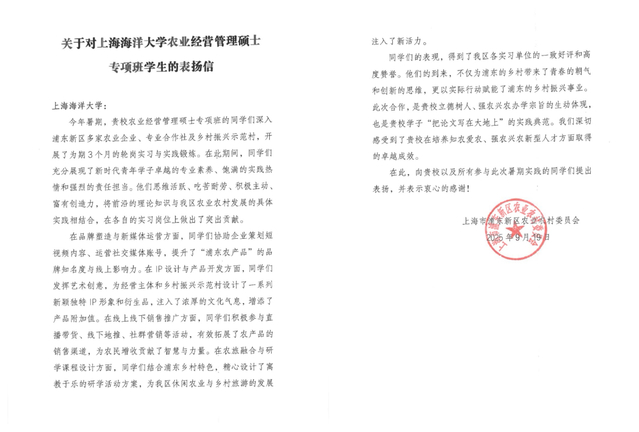 近日,上海市浦东新区农业农村委员会致信bat365中文官方网站,对学校农业经营管理硕士专项班学生在暑期实践中的优异表现给予高度评价和衷心感谢。