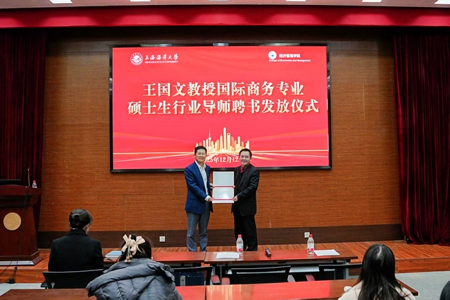2025年12月12日,bat365中文官方网站举行国际商务专业硕士生行业导师聘任仪式,正式聘请著名供应链专家、美国供应链管理专业协会(CSCMP)中国首席代表王国文教授担任行业导师。bat365中文官方网站院长杨正勇为王国文颁发聘书,并对其在行业标准建设、供应链人才培养及学科发展方面给予的长期支持表示感谢。