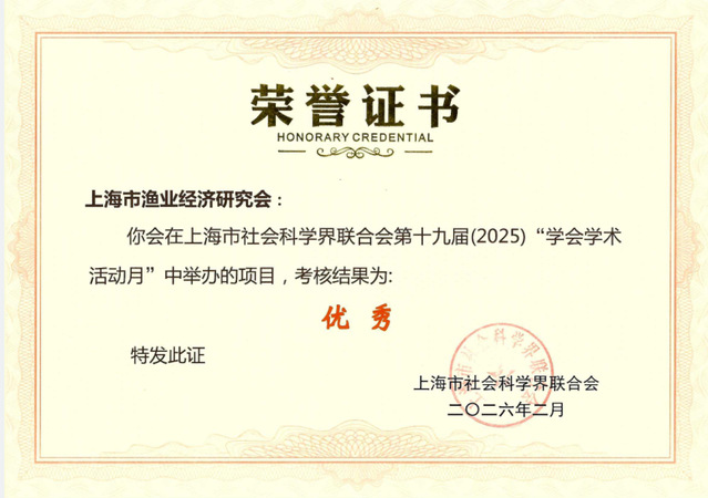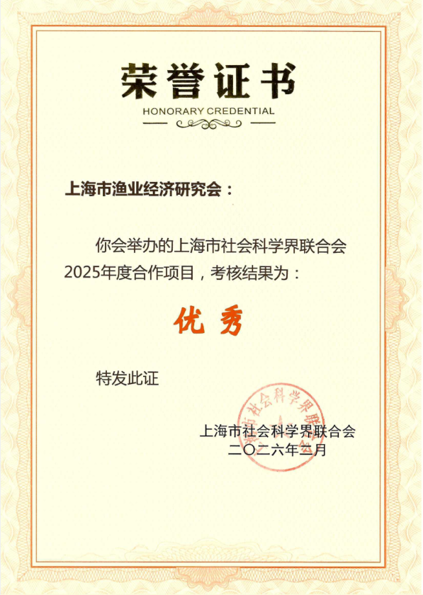 3月5日,上海市社会科学界联合会召开2026年度学术团体负责人大会暨党建工作会议。会议对2025年度合作项目优秀成果和“学会学术活动月”项目优秀成果进行了表彰。上海市渔业经济研究会申报的“重大水产品安全风险与防范研讨会”和“海洋经济高质量发展下的海洋渔业战略青年学者论坛”两项活动,凭借主题鲜明、组织周密、成效显著,双双荣获“优秀”表彰。